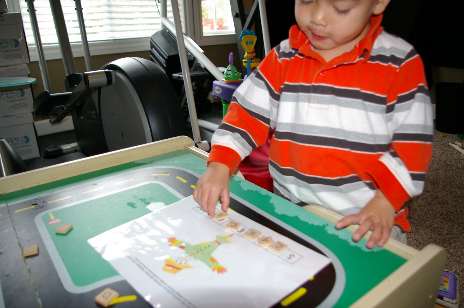 And a new one for us - a lacing card. Big Monkey didn't quite understand going from hole to hole around the apple. He tried going straight across and gave up shortly after the lace got all knotted and tangled. We'll work on this concept.